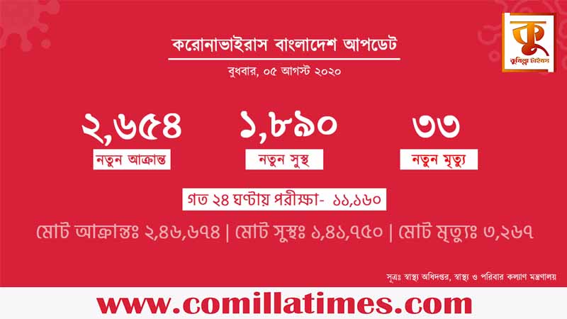 বুধবার দুপুরে স্বাস্থ অধিদপ্তরের অতিরিক্ত মহাপরিচালক অধ্যাপক ড. নাসিমা সুলতানা জানান, করোনাভাইরাসে আক্রান্ত হয়ে দেশে গত ২৪ ঘন্টায় আবারো ৩৩ জনের মৃত্যু হয়েছে। এনিয়ে দেশে করোনায় আক্রান্ত হয়ে ৩ হাজার ২৬৭ জনের মৃত্যু হয়েছে। এ ছাড়া দেশে নতুন করে ১,৩৫৬ জন করোনাভাইরাসে আক্রান্ত ব্যাক্তি শনাক্ত হয়েছে। এনিয়ে দেশে মোট ২ লাখ ৪৬ হাজার ৬৭৪ জন করোনায় আক্রান্ত রোগি শনাক্ত হয়েছে। নতুন করে সুস্থ হয়েছে ১৮৯০ জন। এ নিয়ে সর্বোমোট ১ লাখ ৪১ হাজার ৭৫০ জন সুস্থ হয়েছেন।
