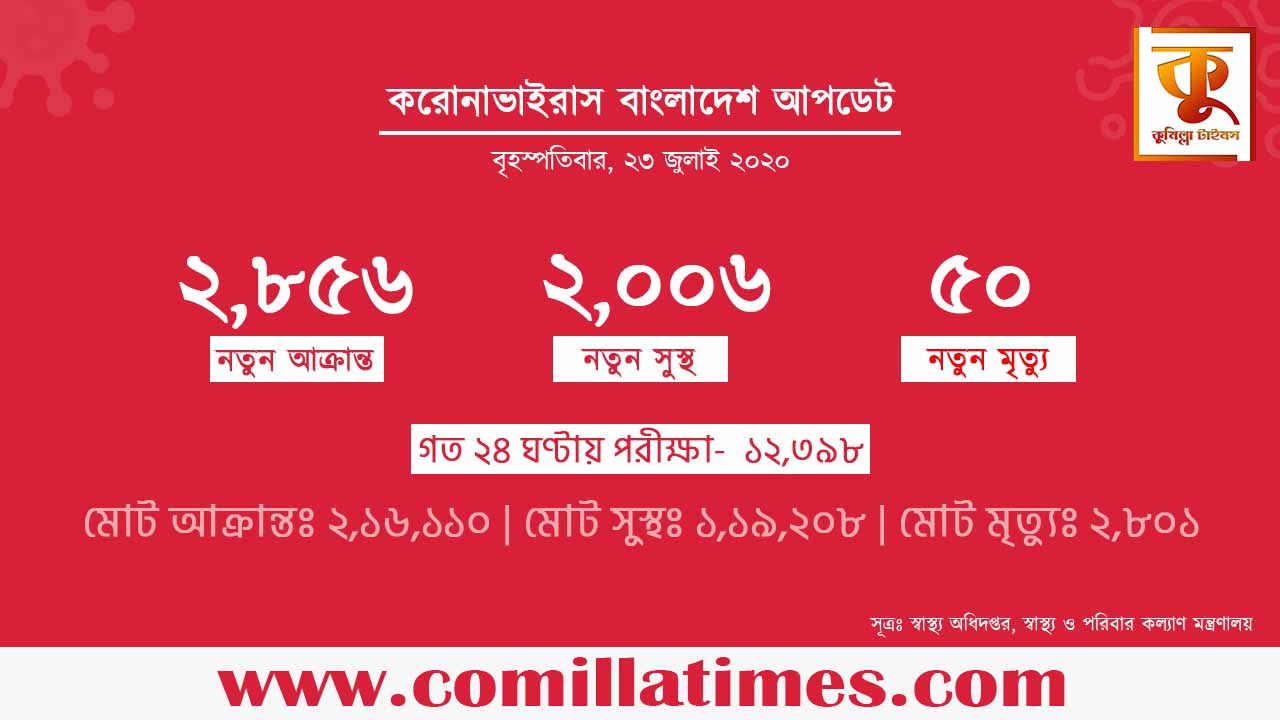 গত ২৪ ঘন্টায় ৫০ জনের মৃত্যু, নতুন আক্রান্ত ২৮৫৬