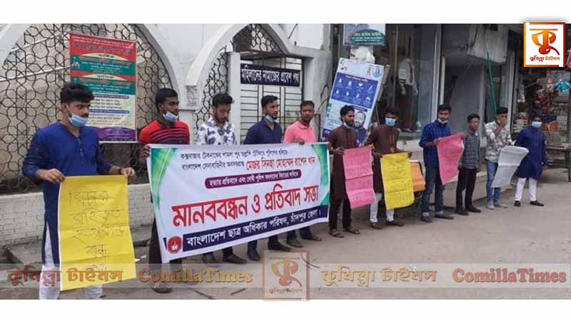 কক্সবাজার টেকনাফের শামলাপুর তল্লাশি চৌকিতে পুলিশের গুলিতে সেনাবাহিনীর অবসরপ্রাপ্ত মেজর (অবঃ) সিনহা মোঃ রাশেদ খান হত্যার প্রতিবাদে ও দোষী পুলিশ সদস্যদের বিচারের দাবিতে মানববন্ধন ও প্রতিবাদ সভা করেছে বাংলাদেশ ছাত্র অধিকার পরিষদ চাঁদপুর জেলা শাখা।