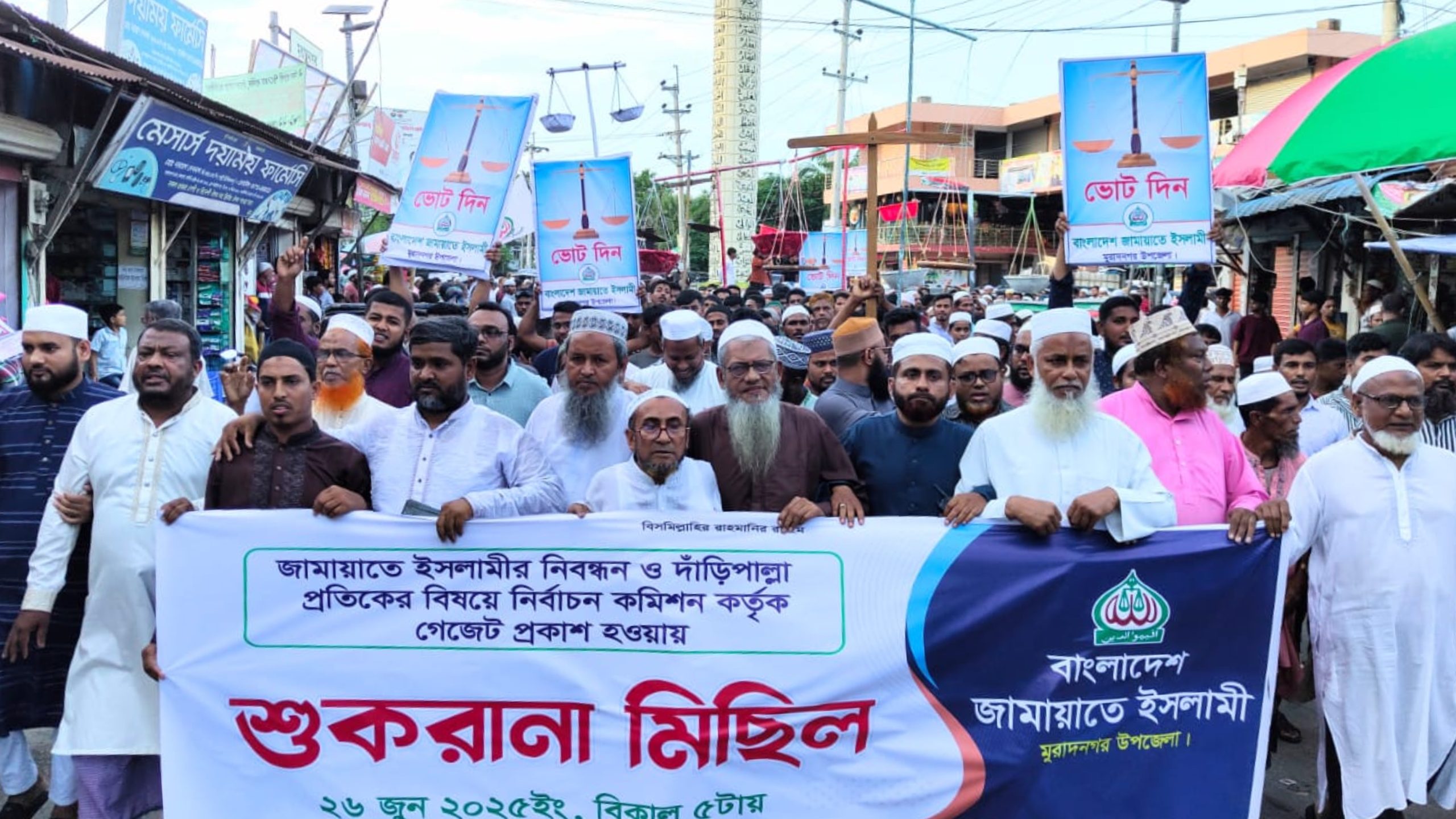 দীর্ঘ আইনি লড়াইয়ের পর রাজনৈতিক দল হিসেবে নিজেদের নিবন্ধন ও দলীয় প্রতীক দাঁড়িপাল্লা ফিরে পাওয়ায় কুমিল্লার মুরাদনগরে শুকরানা মিছিল করেছে জামায়াতে ইসলামী মুরাদনগর উপজেলা শাখা।