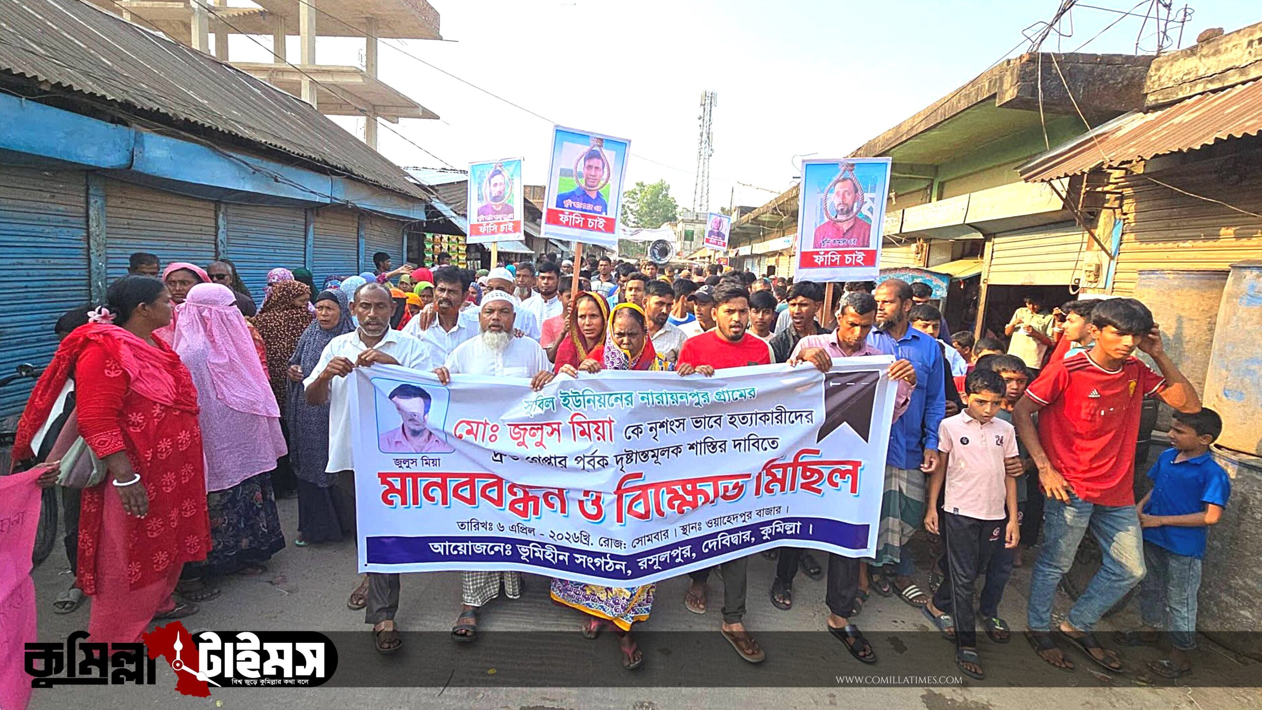 কুমিল্লার দেবিদ্বার উপজেলার সুবিল ইউনিয়নে কৃষক জুলুস মিয়া (৫৫) হত্যার বিচারের দাবিতে বিক্ষোভ ও মানববন্ধন করেছে এলাকাবাসী। মানববন্ধনে নিহতের স্ত্রী শিউলী আক্তার ছোট ছোট শিশু সন্তানদের নিয়ে উপস্থিত হয়ে স্বামী হত্যার বিচার দাবি করলে সেখানে এক হৃদয়বিদারক পরিবেশের সৃষ্টি হয়।