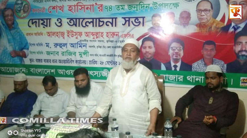 কুমিল্লার মুরাদনগর উপজেলার বাঙ্গরা বাজারে বঙ্গবন্ধুর কন্য আওয়ামিলীগ সভানেত্রী ও মাননীয় প্রধানমন্ত্রী শেখ হাসিনার ৭৪তম জন্মদিন উপলক্ষ্যে বাঙ্গরা বাজার থানা আওয়ামী মৎস্যজীবীলীগের উদ্যোগে দোয়া ও আলোচনা সভা অনুষ্ঠিত হয়েছে।