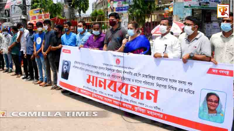 চট্টগ্রাম বাশঁখালীর এমপি মোস্তাফিজুর রহমানের নির্দেশে চট্টগ্রাম প্রেসক্লাবের সামনে বীর মুক্তিযোদ্ধাদের মানববন্ধনে স্বশস্ত্র সন্ত্রাসীদের দিয়ে হামলা চালিয়ে বীর মুক্তিযোদ্ধা, সাংবাদিক ও সন্তানদের আহত করার প্রতিবাদে কুমিল্লা মহানগর মুক্তিযোদ্ধা সংসদ সন্তান কমান্ডের আহ্বায়ক তাহ্সীন বাহার সূচনার নেতৃত্বে কুমিল্লায় মানববন্ধন করেছে মুক্তিযোদ্ধার সন্তান ও প্রজন্মরা ।